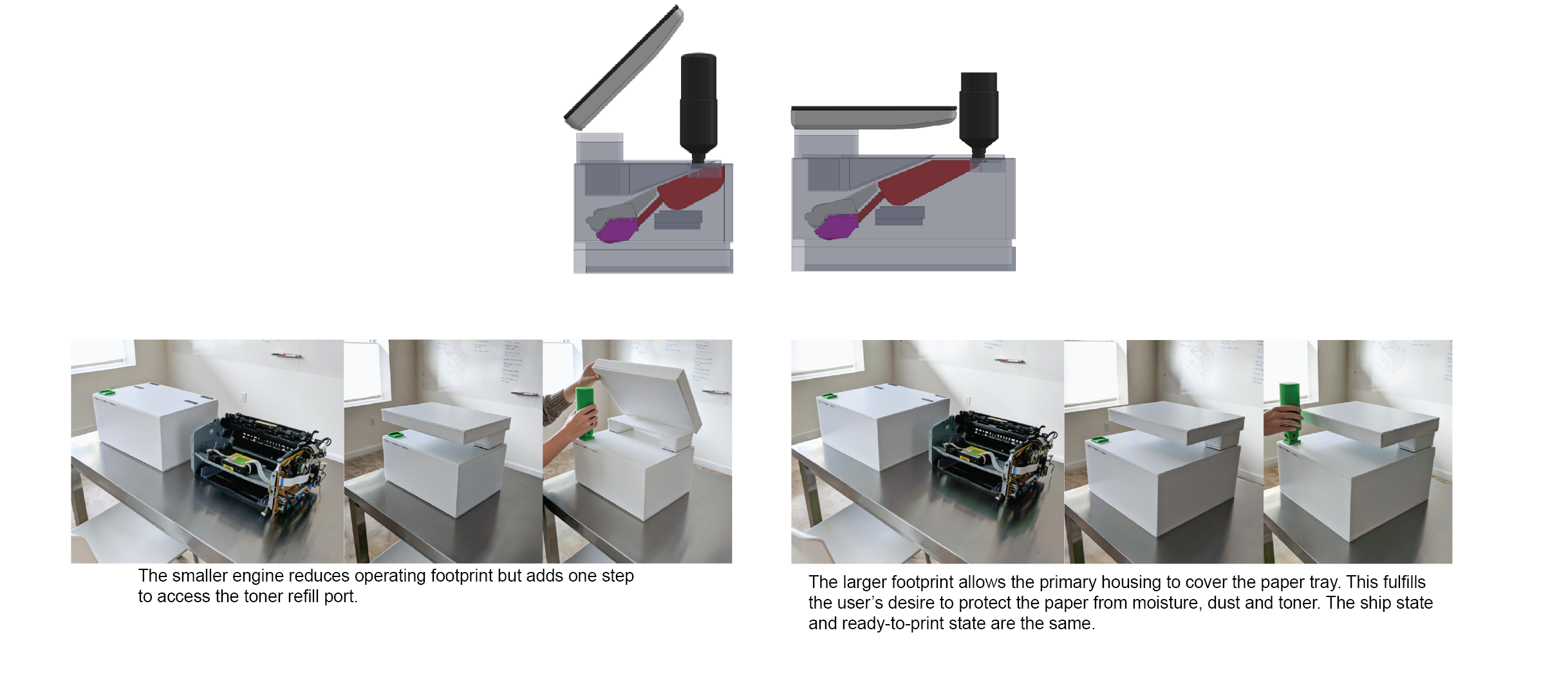 The architecture of the printer was critical, particularly in shaping the discovery and experience of the toner refill feature. It also had implications for palletization and shipping costs. To evaluate the trade-offs between user experience and logistics, cardboard prototypes were built to document and assess the experience. The final solution reduced the unit’s footprint, making it lighter and more space-efficient for countertops, while carefully testing the placement of the fill port to ensure intuitive user discovery.