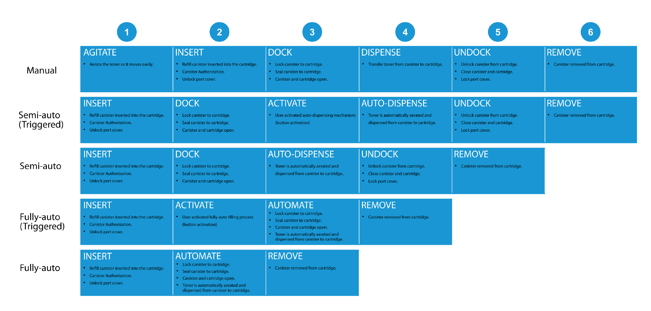 Toner reloading methods explored in collaboration with an external consultancy to rapidly explore options and document user experience trade-offs.